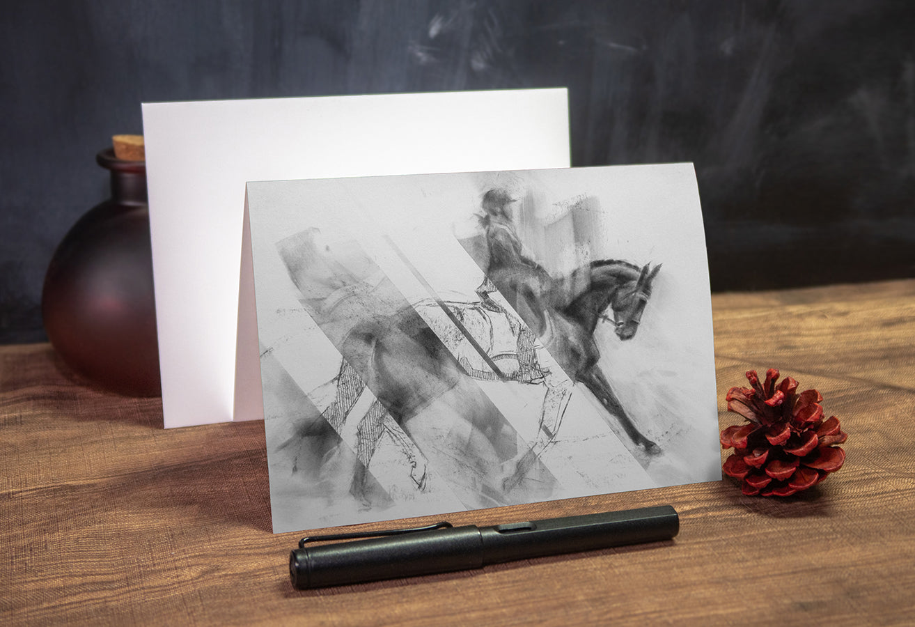 The front features a reproduction of the painting "Dressage", while the back provides information about the artwork and the artist.